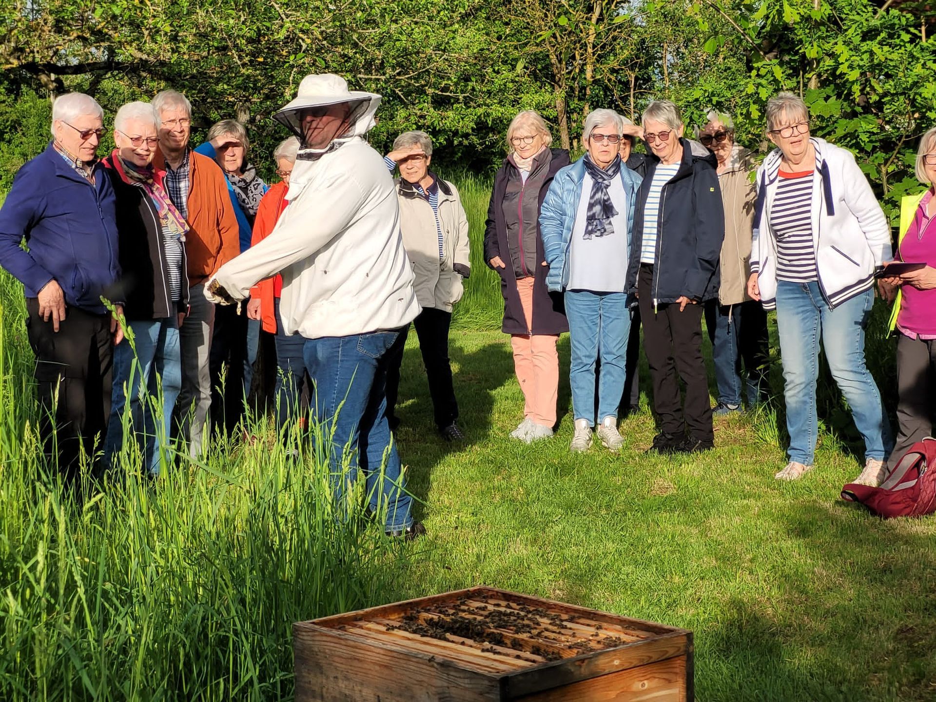 Gegen 18 Uhr trafen ca. 23 „Mittwochsradler“ im Schutzgebiet „Im Schacht“ ein, um einen Einblick in das Thema „Imkerei“ zu bekommen. Vermittelt über Helmut Plaha konnte der NVB-Imker Oliver Ditsch diesen Wunsch erfüllen und mit einem kleinen Vortrag die SKG-Radler entsprechend informieren.