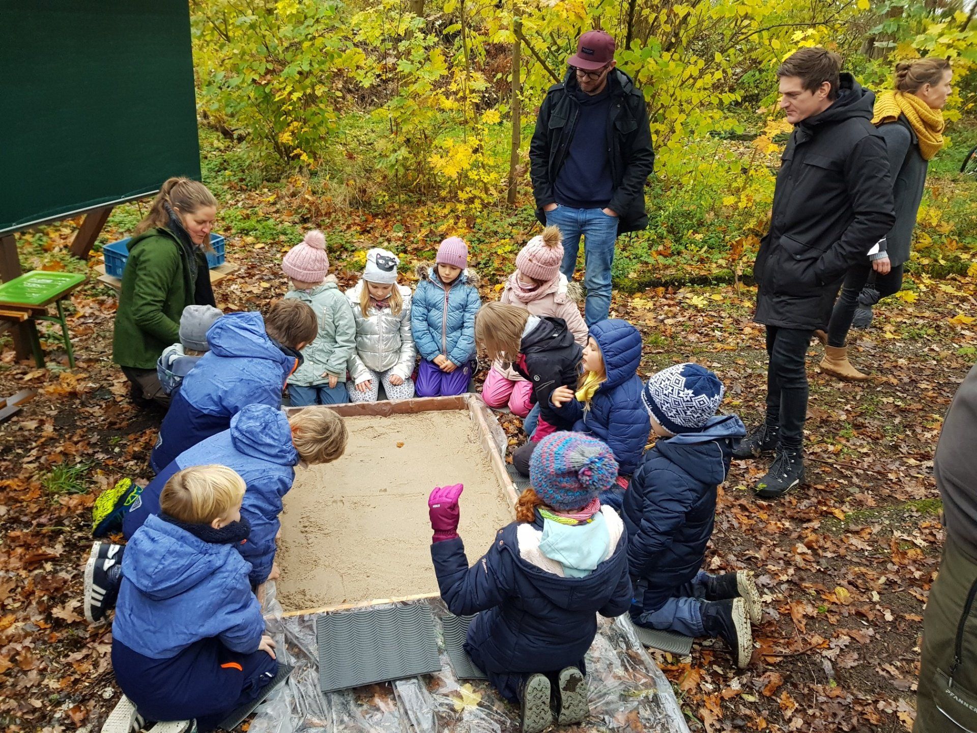 Nach einer kurzen Einführung in die Theorie konnten die Kleinen sich direkt aktiv beteiligen. Zuerst wurde das gesamte Gelände „Im Schacht“ inspiziert und nach Tierspuren unterschiedlichster Art gesucht. Anschließend haben die Kinder in einer extra angefertigten Sandgrube Tierspuren mit einem Stempel eingedrückt und mit Gips aufgefüllt.