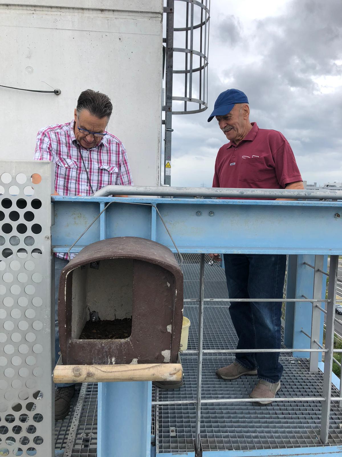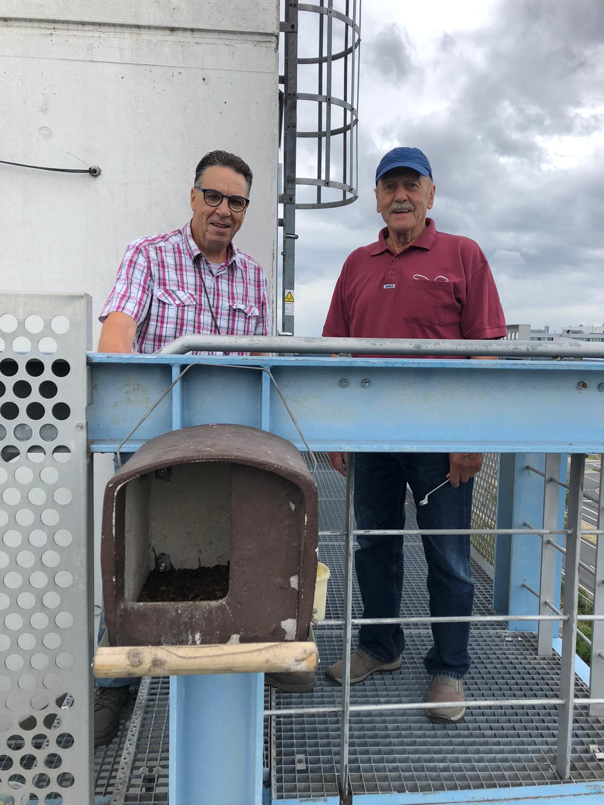 Mit Hubsteiger, Schaufel und Besen rückte das Reinigungsteam den Verschmutzungen seit der letzten Reinigungsaktion in 2019 zu Leibe, wobei die Freude über die gefiederten Glücksbringer auch den Hausbesitzern anzusehen war. "Wir sind froh, wenn die Ersten kommen", sagte Horst Köhler und Herbert Stark.