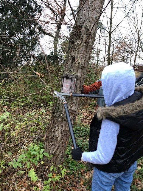 Die Schüler*innen kontrollierten und reinigten die Nistkästen, platzierten eingewachsene Aufhängungen neu an den Bäumen und entfernten Äste, die sich vor den Einfluglöchern befanden.
